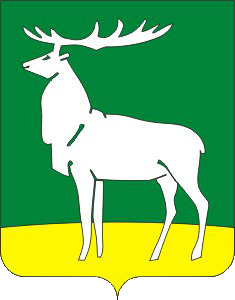 На современном гербе города (1998) в зеленом поле стоящий на золотой земле серебряный олень.